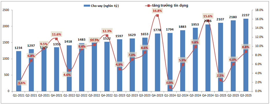 Trong hơn 2 năm vừa qua do NIM suy giảm nên gần như thu nhập lãi thuần không thể tăng dù cho tăng trưởng tín dụng hàng năm vẫn khá cao với khoảng 15% mỗi năm. Tuy nhiên nếu so với các ngân hàng trong ngành thì tăng trưởng tín dụng của BID là không cao do đặc thù là ngân hàng nhà nước nên các thủ tục và điều kiện cho vay cũng khá khắt khe. Trong 2 năm gần đây tăng trưởng tín dụng của ngân hàng đạt khoảng 15-16% mỗi năm và theo thông tin chúng tôi cập nhật được thì tăng trưởng tín dụng cả năm 2025 cũng đạt mức khoảng 15.2%, tương đương kết quả 2024. (Hình 3)