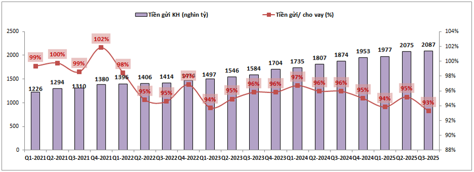 Do tỉ lệ nợ xấu có xu hướng tăng dần từ 2023 cho tới nay trong khi BID vẫn đang duy trì trích lập gần như đi ngang trong suốt các năm qua đã khiến cho bộ đệm dự phòng suy giảm dần. Cụ thể, tỉ lệ bao phủ nợ xấu đã giảm từ mức đỉnh 261% vào Q2-2022 xuống chỉ còn 95% vào cuối Q3-2025. (Hình 6)