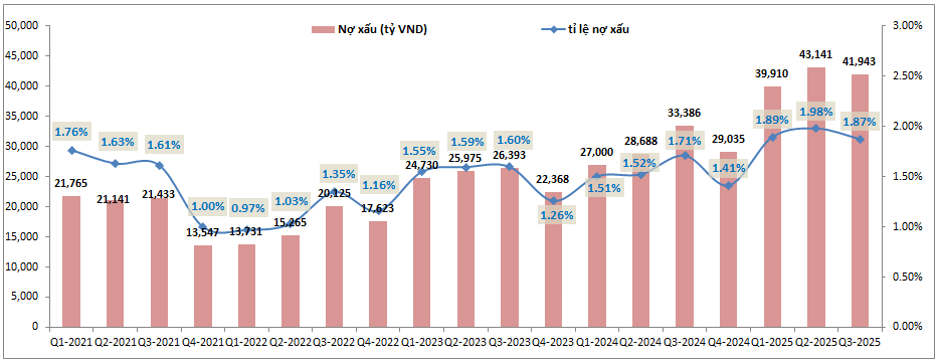 Bức tranh tài chính của BID không có nhiều biến chuyển lớn trong các năm gần đây và vẫn duy trì trong TOP những ngân hàng có sức khỏe tài chính tốt nhất trong ngành. Tuy nhiên chi tiết thì nợ xấu vẫn có xu hướng tăng nhẹ trong các quý gần đây khi tỉ lệ nợ xấu tăng dần từ mức nền 1.5% lên 1.8% như hiện nay. Tính tới cuối Q3-2025 tỉ lệ nợ xấu của ngân hàng là 1.87%, cao hơn 0.46% so với đầu năm, nhưng cũng giảm 0.11% so với Q2 liền trước. So với toàn ngành thì mức nợ xấu trên vẫn là khá an toàn, còn với ngân hàng thì hiện đang ở vùng cao nhất từ 2021 tới nay nên đòi hỏi ngân hàng cũng phải tập trung hơn trong việc xử lý và trích lập đối với những nợ xấu trên. (Hình 5)