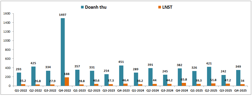 Trước tiên chúng ta cũng vẫn sẽ cập nhật KQKD để nắm rõ tình trạng công ty cũng như hiểu tại sao giá cổ phiếu lại giảm vậy. Kết thúc Q4-2025 CEO ghi nhận doanh thu thuần đạt 349 tỷ đồng, giảm 8.6% yoy. Lợi nhuận sau thuế ghi nhận 34 tỷ đồng, giảm 48.3% yoy. (Hình 1)