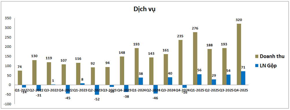 Mảng dịch vụ có đóng góp lớn hơn vào doanh thu của công ty và đang cho thấy xu hướng tích cực dần trong các năm gần đây. Doanh thu dần tăng lên và đặc biệt là lợi nhuận đã ghi nhận mức lãi tại 5 trên 6 quý gần nhất. Trước đó đa phần là ghi nhận lỗ hoặc hòa vốn gây áp lực khá lớn lên KQKD chung của công ty. Mảng dịch vụ của CEO chủ yếu liên quan tới các dịch vụ khách sạn, du lịch nghỉ dưỡng nên có phần tích cực trong các năm gần đây khi kinh tế phục hồi cũng như công ty đưa thêm các dự án mới vào vận hành giúp mang lại doanh thu tốt hơn so với trước. Trong các năm tới khả năng cao mảng dịch vụ sẽ tiếp tục duy trì tích cực khi đi vào hoạt động ổn định hơn. (Hình 2)