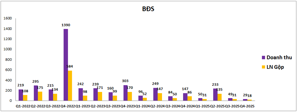 Trong khi đó mảng BĐS lại đang cho thấy sự sụt giảm dần từ 2022 cho tới nay, doanh thu lợi nhuận sụt giảm sau từng quý do tiến độ bàn giao dự án chậm và cũng không có nhiều dự án gối đầu cho mảng BĐS. (Hình 3)