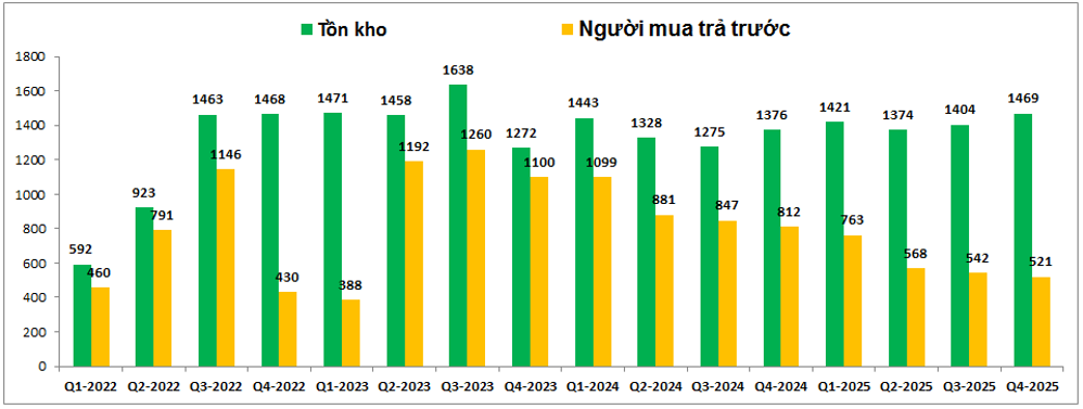 Đây là câu hỏi thứ 2 mà nhiều nhà đầu tư đang nắm giữ CEO ở thời điểm hiện tại đặt ra và cũng cần tìm để xem có nên hi vọng gì không với cổ phiếu này. Như đã phân tích khá rõ về đóng góp chi tiết của từng mảng kinh doanh ở phần trên, chúng ta có thể thấy dù mảng dịch vụ đang có xu hướng tích cực nhưng do biên lợi nhuận gộp thấp nên mức độ đóng góp vào lợi nhuận là không quá lớn. Trong khi đó mảng BĐS có biên lợi nhuận cao lại đang đi lùi do các dự án hạch toán ít dần. Công ty không thuyết minh chi tiết tồn kho từng dự án nên chúng ta cũng khó nắm bắt được biến động tồn kho của từng dự án trong các năm gần đây. Nhưng nhìn tổng thể về chỉ số hàng tồn kho cũng như khoản người mua trả trước ngắn hạn có thể thấy tình hình không quá khả quan với CEO. Tồn kho chung có xu hướng tăng khá chậm sau mỗi quý phản ánh tiến độ và tốc độ triển khai dự án là chậm. Ngoài ra khoản người mua trả trước lại sụt giảm dần từ đỉnh Q3-2023 cho tới nay do hạch toán dần vào lợi nhuận khi bàn giao cho khách. Hiện khoản này còn 521 tỷ đồng và dự kiến có thể đủ hạch toán ở mức độ thấp trong 1-2 năm tới cho CEO. (Hình 4)