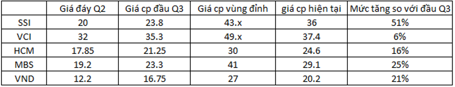 Không thể phủ nhận kết quả kinh doanh ấn tượng mà các công ty đã đạt được trong Q3 vừa qua nhưng nếu nhìn lại thì giá cổ phiếu đa phần các công ty đã tăng rất nhiều trong Q3 và những phiên điều chỉnh vừa qua chưa làm giá cổ phiếu trở lại thời điểm đầu Q3 được. Dưới đây là bảng thống kê ví dụ 5 công ty chứng khoán lớn nhất đang niêm yết trên sàn hiện nay về diễn biến giá trong thời gian qua: