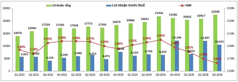 Tuy nhiên NIM của CTG vẫn tiếp tục suy giảm quý thứ tư liên tiếp từ 3% Q3-2024 xuống chỉ còn 2.63% trong Q3-2025. Điều này khiến cho thu nhập lãi thuần của CTG chỉ tăng 10.3% so với cùng kỳ dù tăng trưởng tín dụng 9 tháng đầu năm 2025 đã đạt mức 15.6%, nhỉnh hơn chút so với trung bình toàn ngành. Xu hướng suy giảm NIM hiện cũng đang diễn ra tại hầu hết các ngân hàng do các ngân hàng đều đang có xu hướng duy trì lãi suất cho vay đầu ra thâp để hỗ trợ nền kinh tế cũng như đẩy mạnh tín dụng trong khi nguồn tiền gửi gặp khó khăn nên phải đẩy nhẹ tăng lãi suất huy động để hút tiền đầu vào cho ngân hàng. Xu hướng này vẫn sẽ tiếp tục trong Q4-2025 và có thể cả sang 2026 nên chúng ta cũng chưa thể kỳ vọng NIM của CTG có thể tăng trở lại ngay mà chỉ có thể kỳ vọng sẽ thu hẹp đà giảm và sớm đi ngang tạo nền thấp trong các quý tới. Khi đó tăng trưởng tín dụng ở mức cao sẽ là động lực thúc đẩy cho tăng trưởng của mảng kinh doanh lãi.