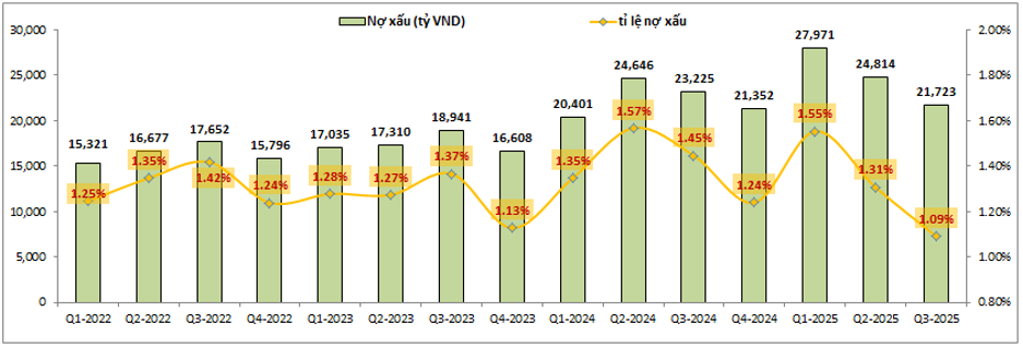 Bức tranh tài chính của CTG trong các quý gần đây đang có xu hướng sáng dần lên dù ngân hàng đã chủ động giảm trích lập để hỗ trợ tăng trưởng lợi nhuận của ngân hàng. Điều này có được là nhờ ngân hàng đã tích lũy bộ đệm dự phòng dày từ trước và cùng với đó là kiểm soát rất tốt nợ xấu của mình. Cụ thể tỉ lệ nợ xấu sau Q3-2025 của CTG chỉ ở mức 1.09%, mức thâp nhất trong 3-4 năm trở lại đây của CTG. (Hình 2)