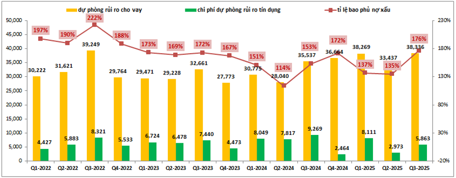 Về trích lập, dù duy trì trích lập thấp tại 3 trên 4 quý gần nhất nhưng bộ đệm dự phòng của ngân hàng vẫn duy trì ở mức cao nhờ kiểm soát tốt nợ xấu. Hiện sau Q3-2025 tỉ lệ bao phủ nợ xấu của ngân hàng vẫn đạt mức 176%, mức cao nhất kể từ 2023  cho tới nay và hoàn toàn có thể hướng tới mốc trên 200% như giai đoạn 2022 trước đó. (Hình 4)