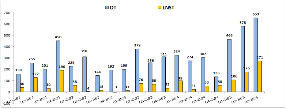 CTS đã ra BCTC với kết quả kinh doanh ấn tượng khi cả doanh thu và lợi nhuận đều vượt đỉnh lịch sử vừa được thiết lập tại Q2-2025. Cụ thể doanh thu thuần đạt 653 tỷ đồng, tăng 2.16 lần so với cùng kỳ. Lợi nhuận sau thuế đạt 271 tỷ đồng, tăng tới 5.11 lần. Điều này cho thấy hiệu quả hoạt động của công ty là rất tốt trong bối cảnh thị trường chung đang rất tích cực. (Hình 1)