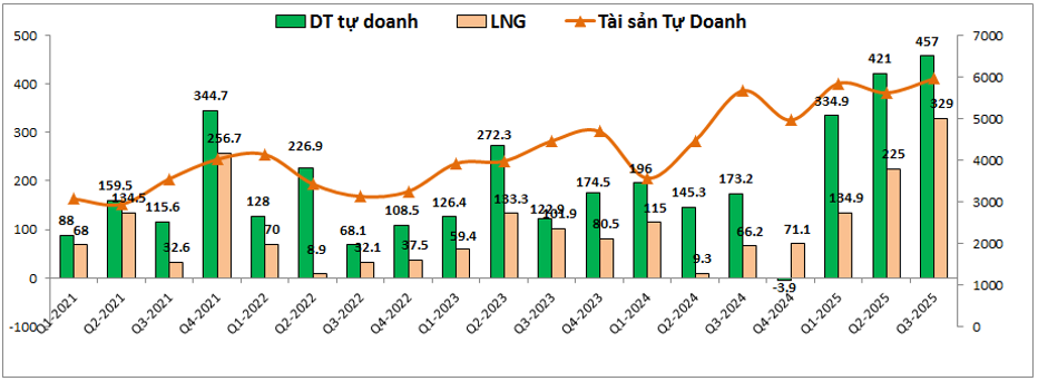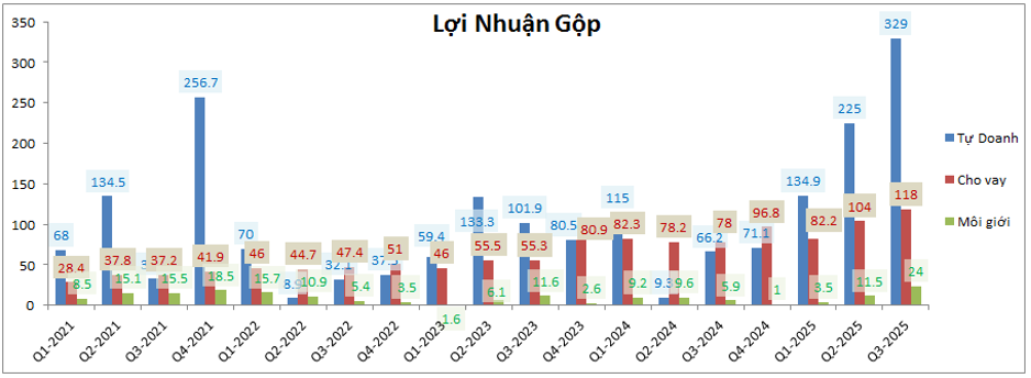 Cụ thể lợi nhuận gộp mảng tự doanh Q3-2025 của CTS lên tới 329 tỷ đồng, tăng mạnh tới 5 lần so với cùng kỳ. Và nếu so với Q2 gần nhất cũng tăng trưởng tới 46%. Đáng lưu ý là trong cơ cấu tự doanh của CTS, cổ phiếu chỉ chiếm 12%, tỉ lệ rất thấp trong khi các tài sản an toàn như tiền gửi, trái phiếu chiếm tới 88%. Điều này có nghĩa cổ phiếu công ty đang nắm giữ rất tốt hoặc tài sản tự doanh tăng lên nhanh hoặc công ty đã chốt lời nhiều tài sản tự doanh trong Q3. Chi tiết như thế nào chúng ta sẽ phân tích phần sau bài viết.