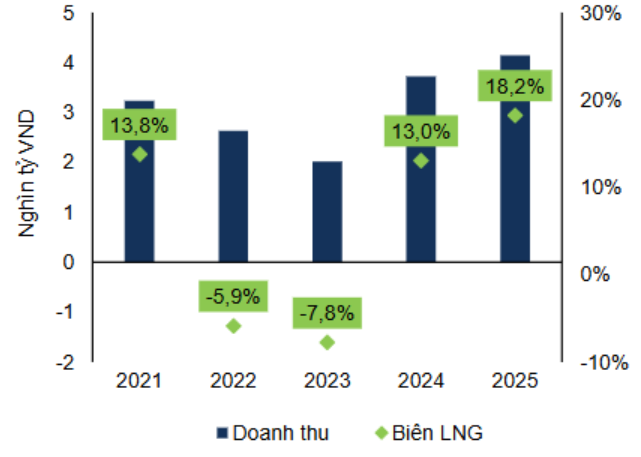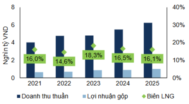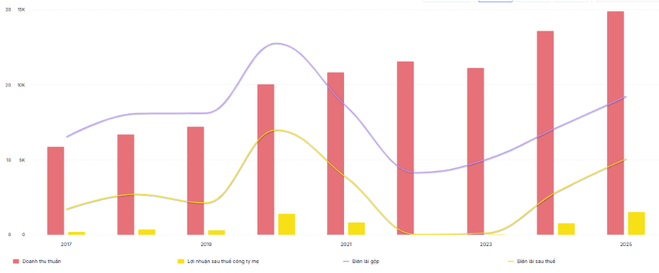 Trong năm 2025, lợi nhuận gộp đạt 2.747 tỷ đồng (+42% yoy), biên lãi gộp đạt 18,4% trong đó: