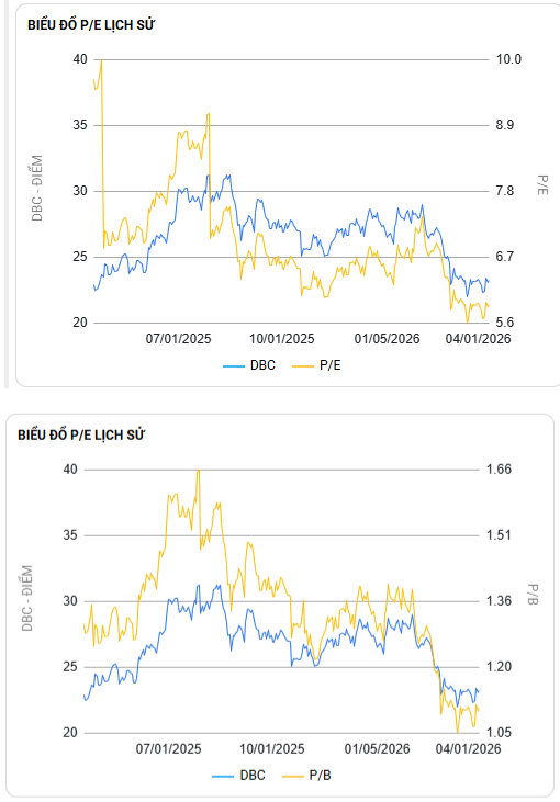 Tổng kết lại, chúng tôi cho rằng 2026 là một năm DBC có thể ghi nhận nhiều khó khăn, khi thị trường chăn nuôi đang có nhiều biến động trái chiều. Chúng tôi cho rằng, mức tăng trưởng doanh thu khoảng 10% cho năm 2026 là hợp lý, trong khi đó lợi nhuận sẽ đi lùi do giá TĂCN chịu ảnh hưởng tiêu cực từ những cuộc căng thẳng địa chính trị. Vì thế, chúng tôi dự phóng mức doanh thu cho năm 2026 vào khoảng 16.400 tỷ (loại trừ doanh thu nội bộ) và LNST đạt khoảng 1.100 tỷ đồng. Với kế hoạch kinh doanh và tình hình thực tế, chúng tôi cho rằng đây là lí do khiến giá cổ phiếu DBC đã lùi sâu khoảng 30% từ đỉnh tháng 7/25.