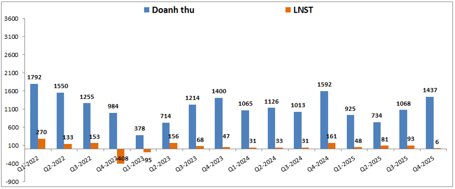 Trước tiên chúng ta cũng sẽ cập nhật nhanh KQKD Q4 và cả năm 2025 của DXG để xem lại tình trạng doanh nghiệp trong thời gian vừa qua. Kết thúc Q4-2025 DXG ghi nhận doanh thu thuần đạt 1,437 tỷ đồng, giảm 9.7% yoy. Đáng chú ý lợi nhuận sau thuế chỉ ghi nhận 6 tỷ đồng dù cho lợi nhuận gộp đạt tận 840 tỷ đồng, tăng 6.5% yoy nhờ biên lợi nhuận gộp tốt hơn so với cùng kỳ. (Hình 1)