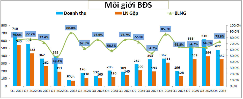 Ngoài mảng BĐS thì DXG còn kinh doanh trong mảng môi giới BĐS khi sở hữu công ty con là DXS chuyên về môi giới BĐS (DXG nắm giữ khoảng gân 56%). DXS trong 2 năm gần đây đã có sự phục hồi khá tốt nhờ thị trường BĐS ấm dần trở lại trong môi trường lãi suất rẻ từ 2023 cho tới Q3-2025. Thanh khoản giao dịch tăng giúp cho KQKD của công ty tăng trưởng khá tốt. Q4-2025 doanh thu mảng môi giới vẫn đóng góp cho DXG 477 tỷ đồng doanh thu và 352 tỷ đồng lợi nhuận gộp, qua đó giúp ghi nhận 3 quý liên tiếp doanh thu và lợi nhuận ở mức cao. (Hình 4)