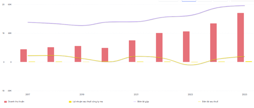 Nhờ giá vốn hàng bán thấp tăng chậm hơn doanh thu, nên lợi nhuận gộp đạt hơn 10 nghìn tỷ, tương đương biên lãi gộp đạt 19.6% – và là con số cao nhất từ trước tới nay của FRT. Mặc dù biên lãi gộp của chuỗi FPT Shop giảm (chỉ còn 11,9%), nhưng nhờ sự cải thiện tích cực từ chuỗi Long Châu, nên nhìn chung biên lãi gộp của FRT đã ghi nhận con số cao kỷ lục trong năm 2025.