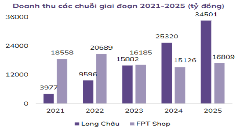Trong năm 2025, nhờ cả mảng Long Châu và FPT Shop doanh thu đều vượt kế hoạch, nên doanh hợp nhất của FRT đạt 51.083 tỷ đồng – tăng trưởng 27% yoy. Trong đó, chuỗi Long Châu là động lực tăng trưởng chính, đạt 34.501 tỷ đồng doanh thu (+36% yoy) và hoàn thành 107% kế hoạch năm. Chuỗi FPT Shop đang trong quá trình nỗ lực phục hồi, khi ghi nhận 16.809 tỷ đồng doanh thu (+11% yoy), hoàn thành 105% kế hoạch năm.