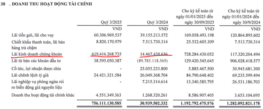 Gex đã công bố bctc Q3 với doanh thu đạt 9,970 tỷ đồng, tăng 12.6% yoy. LNST đạt 622 tỷ đồng, tăng mạnh 6.28 lần so với cùng kỳ. Tuy nhiên tăng trưởng lợi nhuận mạnh của GEX không phải đến từ mảng kinh doanh cốt lõi khi mà tăng trưởng lợi nhuận gộp chỉ đủ bù cho tăng trưởng của các chi phí trong Q3. Lợi nhuận đột biến tới từ hoạt động tài chính ghi nhận 756 tỷ đồng trong khi cùng kỳ chỉ là 31 tỷ đồng. Kiểm tra thuyết minh có thể thấy khoản lợi nhuận này gần như toàn bộ tới từ hoạt động đầu tư chứng khoán của công ty với gần 620 tỷ đồng, chi tiết như hình dưới: