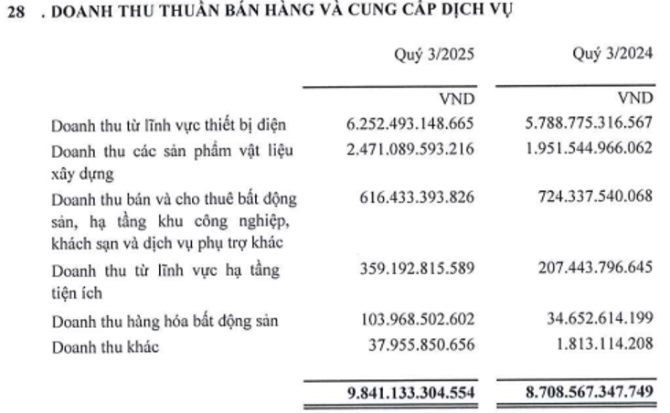 Về KQKD mảng chính trong Q3, chúng ta có thể thấy các mảng kinh doanh chính đều ghi nhận tăng trưởng như thiết bị điện tăng 8%, vật liệu xây dựng tăng hơn 20%, kcn tăng 70% về doanh thu. Tuy nhiên mảng BDS lại sụt giảm và tỉ trọng mảng thiết bị điện chiếm tới 64% nên doanh thu tổng chỉ tăng được 12.6%. Lợi nhuận gộp của công ty cũng chỉ tăng được 10.4% trong khi các chi phí lại tăng mạnh ( chi phí lãi vay tăng 31.8% , chi phí bán hàng tăng 26%, chi phí quản lý doanh nghiệp tăng 29%) nên nếu trừ đi khoản lãi đột biến từ tài chính thì lợi nhuận thuần của GEX gần như tương đương cùng kỳ.
