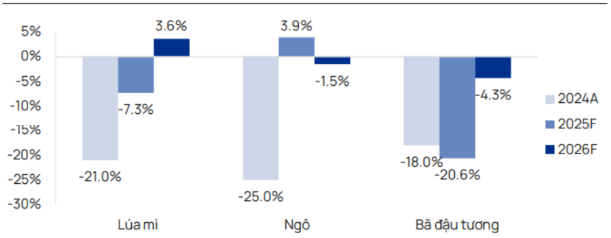 - Về giá TĂCN: Mặc dù tự chủ 100% TĂCN trong mô hình kinh doanh, nhưng tới 70% nguyên liệu này vẫn được nhập khẩu từ nước ngoài, nên bất cứ sự tăng/giảm nào trong cấu thành sản phẩm cũng sẽ ảnh hưởng tới biên lãi của HPA. Chúng tôi có tham khảo báo cáo về Triển vọng Thị trường Hàng hóa (CMO) trong tháng 10.2025, dự báo về thị trường giai đoạn 2025 – 2026, thì Ngân hàng Thế giới dự phóng giá lúa mì giảm mạnh 7,3% trong năm 2025, sau đó phục hồi nhẹ 3,6% trong năm 2026. Giá ngô được dự phóng phục hồi nhẹ 3,9% trong năm 2025, sau đó giảm nhẹ 1,5% trong 2026. Giá bã đậu tương được dự phóng tiếp tục suy yếu trong dài hạn. Để dễ theo dõi thì chúng tôi xin tổng hợp trong ảnh dưới đây. (Hình 3)