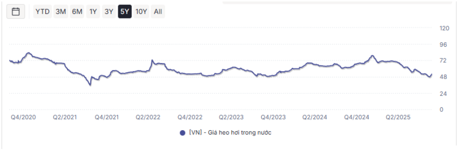 - Về giá lợn: Chúng tôi nhận thấy, hiện giá lợn bị ảnh hưởng rất nhiều bởi dịch tả lợn. Trong những tháng gần đây, giá heo giảm mạnh về dưới mốc 50.000đ/kg mặc dù dịch có quay trở lại. Theo tìm hiểu của chúng tôi, lí do chính là do các hộ chăn nuôi nhỏ lẻ đã bán tháo đàn heo ngay cả khi chưa đủ tuổi xuất chuồng, tạo ra nguồn dư cung tạm thời khiến giá giảm. Chúng tôi kì vọng giá heo sẽ quay trở lại tăng giá từ cuối Q4/25 và sang Q1/26, khi đợt bán tháo này dẫn đến tình trạng thiếu hụt nguồn cung sau đó – như tình trạng đã diễn ra hồi 2019. Đây cũng là thời điểm trùng với dịp Tết tại nước ta, nên kì vọng giá cả và nhu cầu mua sắm hàng hóa tiêu dùng cũng sẽ tăng.