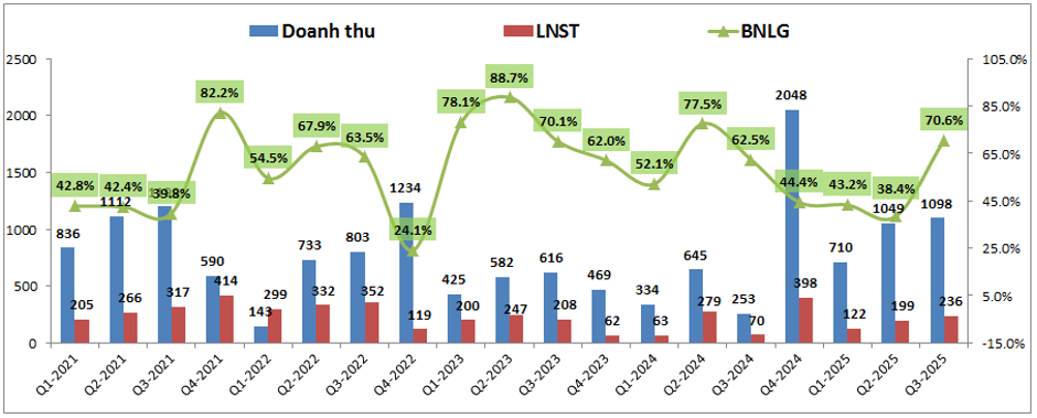 Trong Q3-2025 dự án đã được hạch toán khoảng 20 căn và các căn còn lại sẽ tiếp tục được bàn giao trong Q4-2025. Sở dĩ dự án được bán và bàn giao sớm ngay sau đó là nhờ tiến độ xây dựng gần như hoàn thiện và pháp lý minh bạch. Các đợt mở bán tiếp theo với sản phẩm thấp tầng sẽ tiếp tục được triển khai trong năm 2026. Như vậy với khoảng hơn 200 căn thấp tầng chưa bàn giao, doanh thu dự kiến có thể mang về từ dự án là khoảng 8-9k tỷ đồng, sau khi trừ lợi ích vẫn đạt 4-4.5k tỷ đồng.