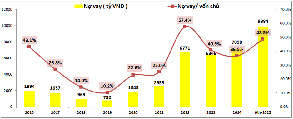 Về tài chính, hiện KDH đang có xu hướng gia tăng nợ vay trong 4 năm gần đây với mục đích chính là triển khai các dự án lớn của mình và thực tế từ Q4-2024 công ty đã bắt đầu được thu trái ngọt khi bắt đầu chu kỳ hạch toán các dự án lớn mang lại lợi nhuận lớn cho công ty. Hiện tới cuối Q3-2025, tổng nợ vay của công ty đạt 9,884 tỷ đồng, tăng gần 1,800 tỷ so với đầu năm và tỉ lệ nợ vay/VCSH đạt 48.5%. Đây là tỉ lệ không quá rủi ro với một doanh nghiệp có quỹ đất sạch, vị trí tốt như KDH, nhưng so với tỉ lệ an toàn ngành thì tỉ lệ trên cũng là cao hơn mức trung bình khoảng 35-40%. (Hình 2)