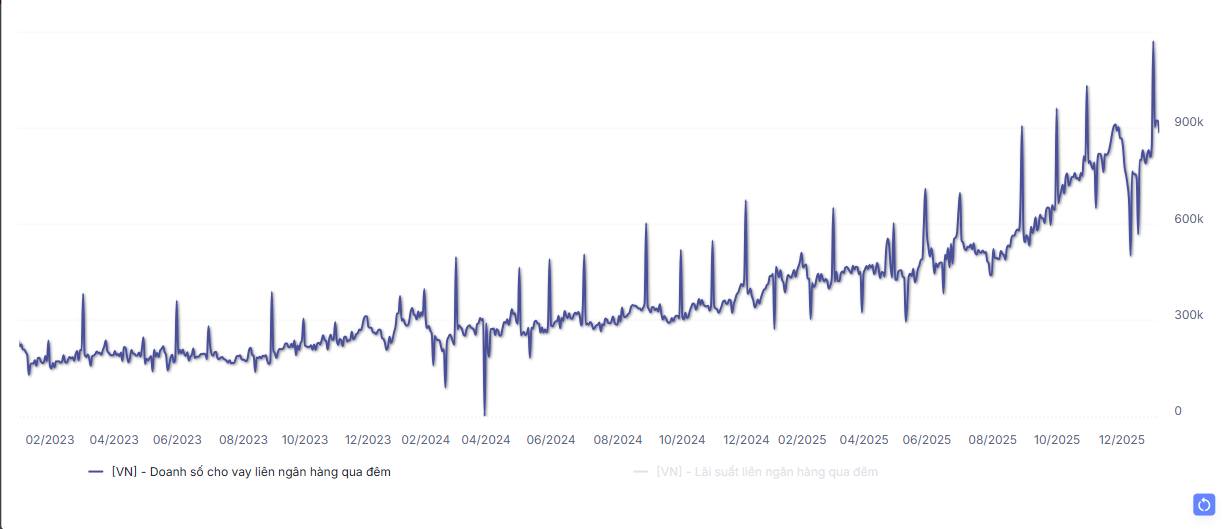 2 tuần gây đây trung bình mỗi phiên doanh số lãi suất ON qua đêm đều xoay quanh 900 ngàn tỷ/phiên. Tăng gấp 2 lần so với khoảng thời gian từ tháng 1-9/2025 chỉ xoanh quanh 400-450k tỷ/phiên.