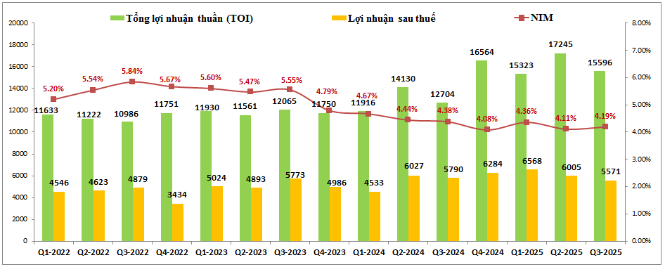 MBB đã công bố BCTC Q3 với tổng lợi nhuận thuần (TOI) đạt 15,596 tỷ đồng, tăng 22.8% yoy. Tuy nhiên lợi nhuận sau thuế trong Q3-2025 lại chỉ ghi nhận 5,571 tỷ đồng, giảm 3.8% yoy ( Hình 1)