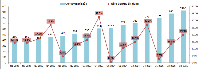 Đầu tiên về mảng kinh doanh lãi của ngân hàng, Q3 MBB ghi nhận thu nhập lãi thuần đạt 12,991 tỷ đồng, tăng 24.7% yoy dù cho NIM vẫn duy trì ở mức nền thấp khoảng 4.19%. Tuy nhiên điểm tích cực là NIM của ngân hàng đã có xu hướng đi ngang và tăng nhẹ chút chứ không còn giảm như giai đoạn cuối 2023 sang 2024 nữa. Động lực lớn nhất thúc đẩy cho thu nhập lãi thuần của MBB tăng trưởng mạnh so với cùng kỳ dù NIM ở nền thấp tới từ tăng trưởng tín dụng của ngân hàng luôn duy trì được ở mức cao trong suốt nhiều năm qua với mức trung bình hàng năm đều trên 25%. Kết thúc Q3-2025 tổng cho vay của MBB đã đạt 931.5k tỷ đồng, tổng tăng trưởng tín dụng 9 tháng đầu năm đạt 19.9%, cao hơn 5% so với cùng kỳ 2024. ( Hình 2)