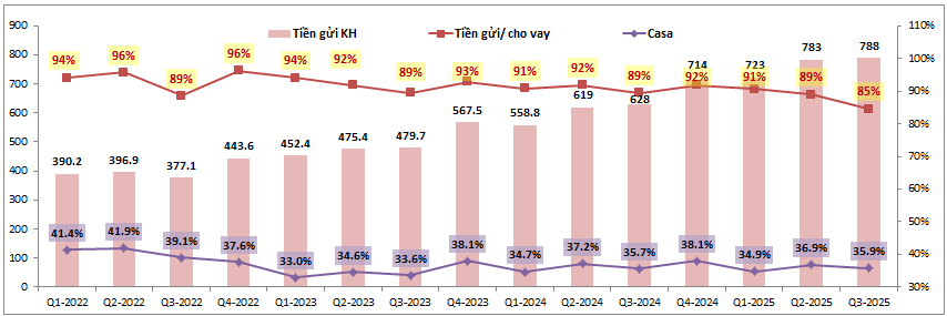 Tuy nhiên bài toán khó với MBB lúc này là việc  huy động đầu vào để phục vụ cho nghiệp vụ cho vay đang tăng trưởng lớn các năm qua. Tính từ đầu năm tổng huy động tiền gửi mới chỉ đạt 788 tỷ đồng, tăng 10.4% so với đầu năm, tỷ lệ tiền gửi/ cho vay cũng giảm xuống 85% so với 92% cuối 2024. Như vậy, tốc độ tăng tiền gửi đang thấp hơn so với cho vay đặt áp lực lên ngân hàng có thể phải nhích nhẹ lãi huy động cũng như tìm kiếm các kênh huy động khác như liên ngân hàng hay trên thị trường 1 để có đủ vốn đáp  ứng cho vay. Điều này có thể khiến NIM của MBB khó tăng trở lại ngay trong các quý tới do áp lực lãi suất đầu vào có thể phải nhích nhẹ lên.