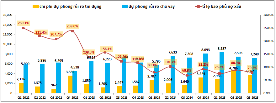 Nguyên nhân chính khiến cho lợi nhuận sau thuế của ngân hàng sụt giảm so với cùng kỳ dù cho tổng lợi nhuận thuần vẫn tăng trưởng gần 23% là do trong Q3-2025 MBB đã trích lập dự phòng rủi ro tín dụng lên tới 3,802 tỷ đồng, tăng tới 132% yoy. Do trong năm 2024 nợ xấu và tỉ lệ nợ xấu của MBB duy trì ở mức cao khiến cho ngân hàng phải đẩy mạnh hơn trích lập từ Q4-2024 cho tới nay trong bối cảnh bộ đệm dự phòng đã không còn đủ để hỗ trợ cho ngân hàng tiếp tục trích lập ở mức thấp như các năm trước.