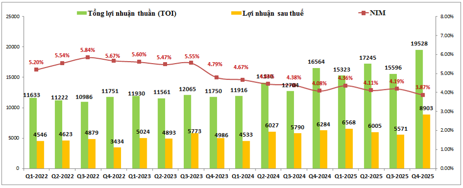 Kết thúc Q4 MBB đã ghi nhận KQKD hết sức ấn tượng với tổng lợi nhuận thuần (TOI) đạt 19,528 tỷ đồng, tăng 17.9% yoy. Lợi nhuận sau thuế đạt 8,903 tỷ đồng, tăng 41.7% yoy. Đáng chú ý các kết quả trên đều là mức cao nhất lịch sử của ngân hàng dù ngành ngân hàng đang trong bối cảnh chung là NIM đều suy giảm. Tính tới cuối Q4-2025 NIM của MBB chỉ còn 3.87%, giảm 0.21% so với đầu năm và giảm gần 2% so với vùng đỉnh cuối 2022. (Hình 1)