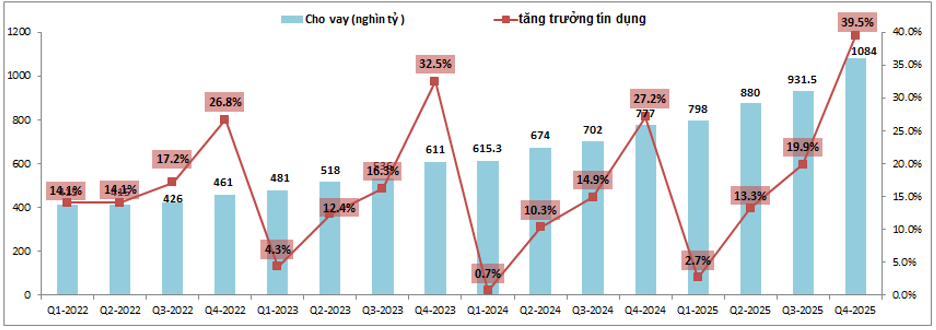 Đây là mảng kinh doanh cốt lõi của ngành ngân hàng và cũng là mảng đã có đóng góp lớn nhất vào tăng trưởng của MBB trong Q4-2025. Động lực lớn nhất hỗ trợ cho thu nhập lãi thuần tăng trưởng mạnh tới từ tăng trưởng tín dụng của ngân hàng cao đột biến trong năm 2025. Cụ thể tổng tăng trưởng tín dụng cả năm 2025 của MBB đạt tới 39.5%, cao hơn tới 12.3% so với 2024 và cũng là mức tăng trưởng tín dụng cao nhất lịch sử của ngân hàng. Đáng chú ý chỉ tính riêng Q4-2025 tăng trưởng tín dụng của MBB đã đóng góp tới gần 20%, tức gần bằng cả 3 quý trước đó cộng lại. (Hình 2)