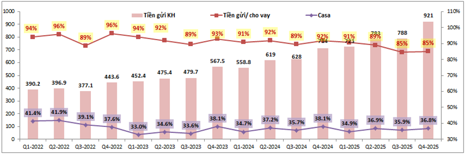 Trong bối cảnh cả ngành bank đều gặp áp lực về huy động đầu vào để phục vụ cho vay tăng trưởng mạnh thì với MBB cũng không phải ngoại lệ. Cụ thể tỉ lệ tiền gửi/cho vay của ngân hàng liên tục sụt giảm từ 2022 cho tới nay. Kết thúc Q4-2025 tỉ lệ tiền gửi/ cho vay chỉ đạt 85%, giảm 11% so với cuối 2022. (Hình 3)