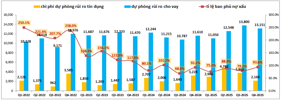 - Mảng hoạt động khác là mảng về nghiệp vụ thu hồi và xử lý nợ xấu của ngân hàng. Trong Q4-2025 cũng ghi nhận lợi nhuận đạt 1,574 tỷ đồng, tăng 30.8% yoy. Với việc NQ42 được luật hóa sẽ là động lực giúp cho mảng này được kỳ vọng tiếp tục tăng trưởng trong khoảng 20-30% trong các quý tiếp theo để hỗ trợ cho tăng trưởng chung của ngân hàng.