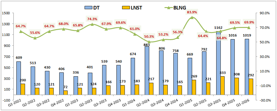 - Thứ 2 là chi phí tài chính trong Q1-2026 tăng khá mạnh so với cùng kỳ khi ghi nhận 280 tỷ đồng, tăng mạnh 73% yoy. Trong đó chủ yếu là chi phí lãi vay.