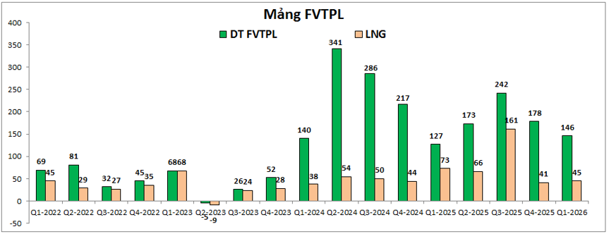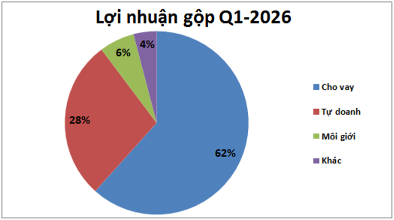 - Đầu tiên là mảng FVTPL (một mảng thuộc tự doanh) trong Q1-2026 tuy ghi nhận doanh thu lớn hơn cùng kỳ nhưng do giá vốn cao nên lợi nhuận gộp lại sụt giảm so với cùng kỳ khi chỉ ghi nhận lợi nhuận gộp 45 tỷ đồng (cùng kỳ đạt 73 tỷ đồng). (Hình 2)