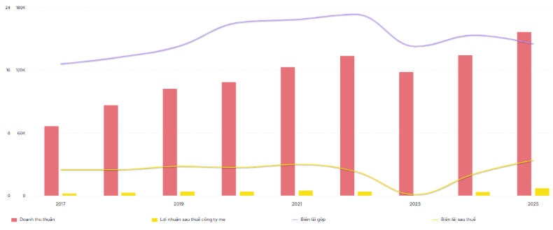Cụ thể, doanh thu cả năm 2025 đạt 156.166 tỷ đồng – tăng 16,2% yoy và hoàn thành 104% kế hoạch đề ra. Bóc tách riêng cơ cấu doanh thu của từng mảng thì: