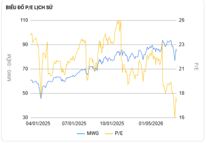Với những luận điểm trên, chúng tôi kỳ vọng MWG trong năm 2026 sẽ đem về lợi nhuận tối thiểu khoảng 8.500 tỷ đồng (+20% yoy), tương đương EPS vào khoảng 5.700 đ/cổ phiếu. Với con số này, PE fwd hoàn toàn có thể về vùng 14–15 lần cho năm nay, cho thấy MWG đang là một món khá hời để đầu tư trong dài hạn.