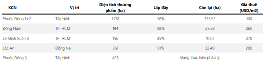 Hiện tại SIP đang sở hữu và hoạt động cho thuê tại 4 KCN là KCN Phước Đông, KCN Đông Nam, KCN Lê Minh Xuân và KCN Lộc An – Bình Sơn với một vài thông tin cơ bản như hình 5 dưới đây: