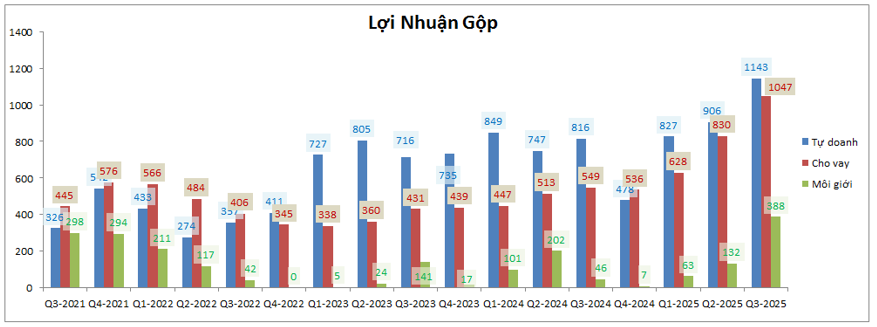 Như vậy có thể thấy tỉ trọng mảng cổ phiếu chiếm khá thấp với chỉ 7% tự doanh. Chưa kể đa phần tài sản này SSI nắm giữ đều là các cổ phiếu có FA tốt cũng như phần lớn dùng để phục vụ cho hoạt động chứng quyền (tăng giảm giá cổ phiếu công ty đều không ảnh hưởng mà sẽ dùng để thu phí giao dịch). Điều này đồng nghĩa mảng tự doanh của SSI sẽ bị ảnh hưởng ở mức khá thấp từ thị trường chung khi giá nhiều cổ phiếu điều chỉnh trong Q4-2025.