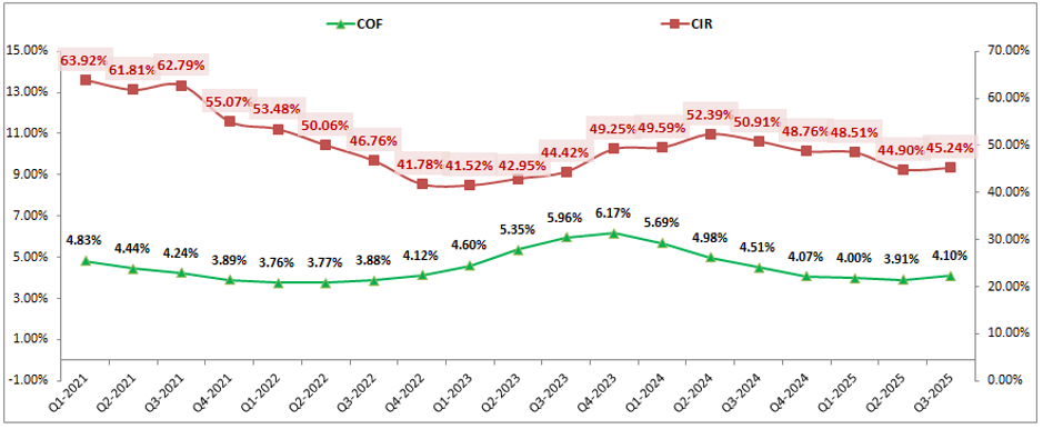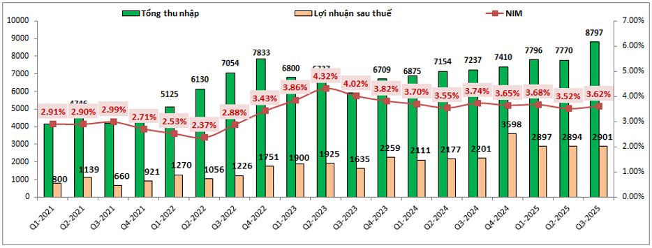 Q3-2025 STB ghi nhận tổng thu nhập thuần (TOI) đạt 8,797 tỷ đồng, tăng 21.6% yoy. Lợi nhuận sau thuế cũng ghi nhận 2,901 tỷ đồng, tăng 31.8% yoy. NIM của STB có xu hướng duy trì đi ngang trong gần 2 năm qua và đây là điều tích cực trong bối cảnh NIM toàn ngành đang trong xu hướng giảm do phải duy trì lãi suất cho vay thấp trong khi áp lực huy động tiền gửi tăng khiến cho các chi phí đầu vào tăng lên. (Hình 1)