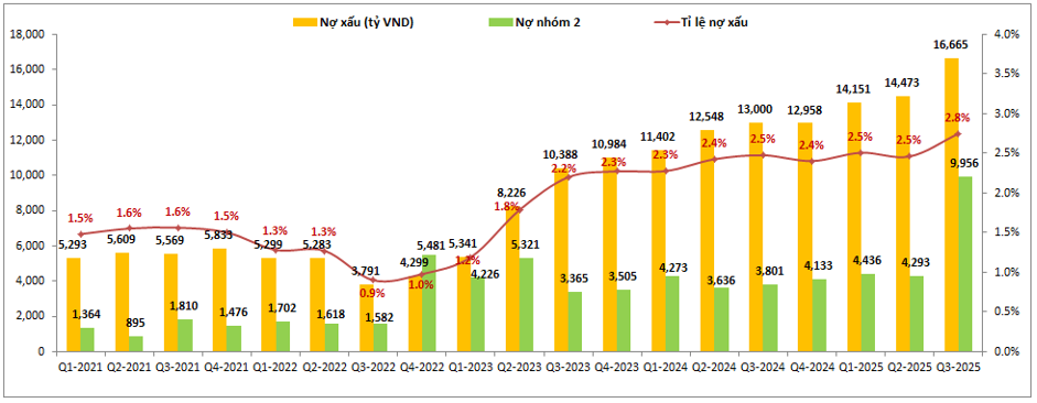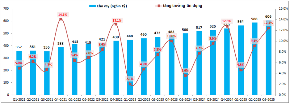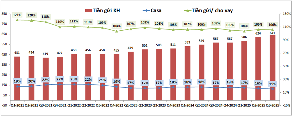 Về tăng trưởng tín dụng, tính tới hết Q3-2025 tổng cho vay của STB đạt khoảng 606k tỷ đồng, tăng trưởng tín dụng đạt 12.4%, mức gần tương đương kết quả cả năm 2024. Tuy nhiên nếu so với mức trung bình của ngành ngân hàng sau 9 tháng thì tăng trưởng tín dụng của STB vẫn ở mức thấp hơn. Tuy nhiên điều này không phải vì khả năng cho vay của STB kém mà là do trong nhiều năm nay STB vẫn đang trong đề án xử lý nợ xấu tồn đọng nên chỉ tiêu tăng trưởng tín dụng hàng năm cho ngân hàng thường ở mức thấp. (Hình 2)