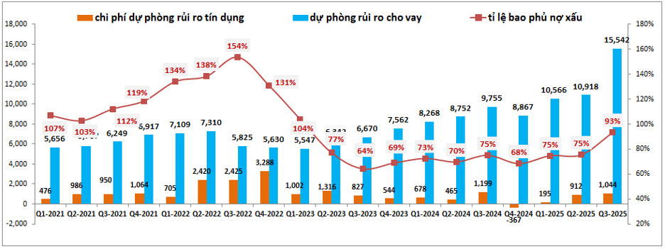 Trong Q3 khi chuyển lượng trái phiếu VAMC về nợ xấu thì STB cũng chuyển tương ứng phần đã trích lập về nên cũng giúp cho trích lập cho vay của ngân hàng tăng lên đáng kể với hơn 15.5k tỷ đồng, tăng khoảng 50% so với Q2 trước đó. Điều này kết hợp với tăng trích lập dự phòng giúp cho bộ đệm dự phòng của STB tăng lên đáng kể với tỉ lệ bao phủ nợ xấu đã tăng lên 93%, mức cao nhất từ 2023 cho tới nay. Trong Q4 và các quý tiếp của năm 2026 khả năng cao STB sẽ duy trì trích lập cao hơn để tiếp tục làm dày bộ đệm dự phòng khi mà có những cơ sở tích cực để làm điều đó như: