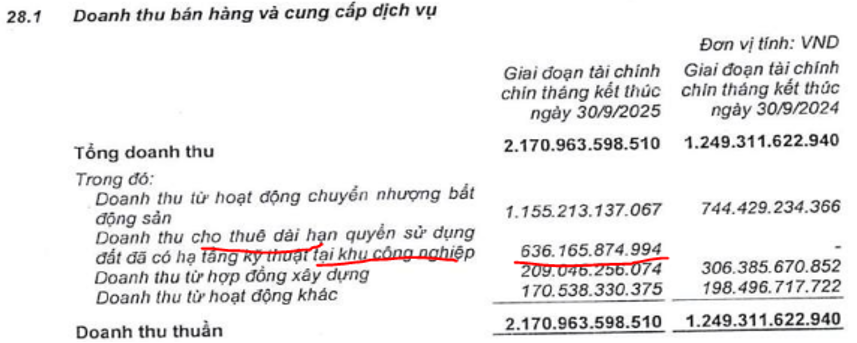 Trong Q3-2025 doanh thu của công ty tăng nhiều nhờ đóng góp chính tới từ mảng cho thuê đất KCN và một phần từ BĐS. Cụ thể mảng BĐS trong Q3 đóng góp 388 tỷ đồng doanh thu, tăng 21.7% yoy. Mảng KCN ghi nhận 636 tỷ đồng doanh thu (cùng kỳ không ghi nhận doanh thu). (Hình 2)