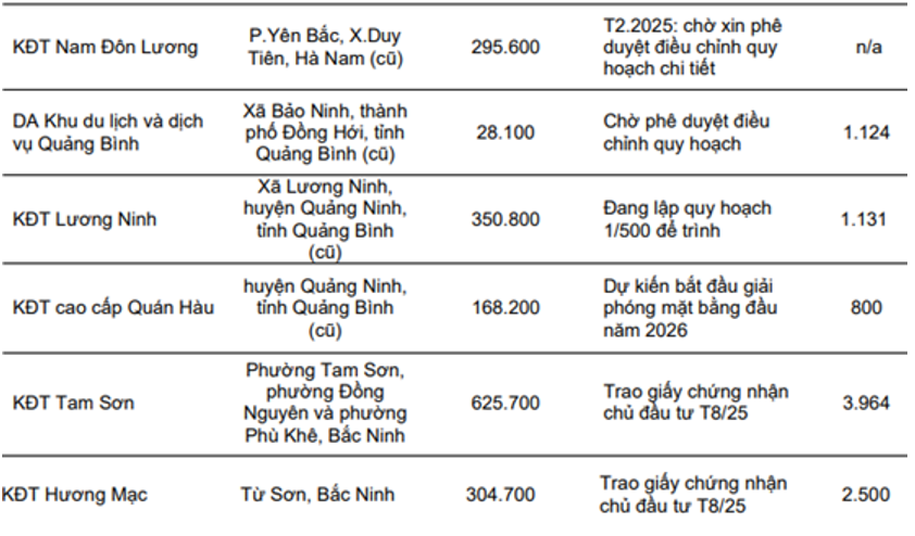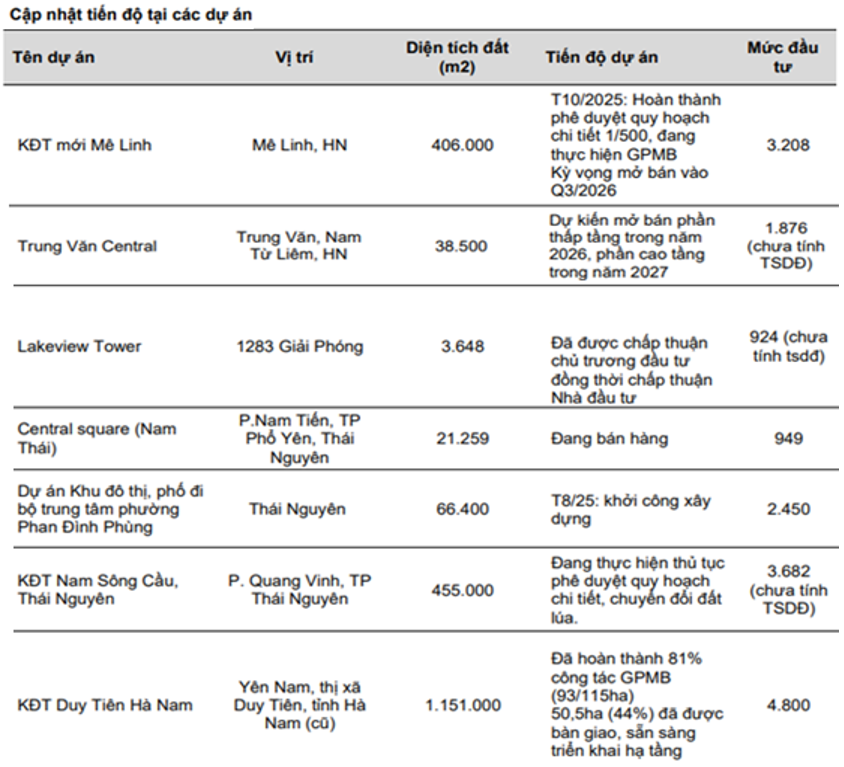 - Nghi Sơn central park: Dự án cũng đang trong giai đoạn hạch toán để đóng góp vào KQKD của công ty. Dự án có diện tích 14.9ha tại Thanh Hóa với tổng quy mô 569 căn thấp tầng (300 lô LK, 213 căn shophouse, 56 căn BT). Hiện dự án đã bán được khoảng 248 căn và đã bắt đầu bàn giao từ 2025. Lũy kế đến Q3-2025 đã bàn giao 254 tỷ đồng. Doanh thu dự kiến toàn dự án khoảng trên 2,500 tỷ đồng và được hạch toán trong 1-2 năm tới cho khách hàng.