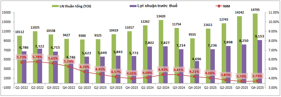 Q4-2025 TCB đã ghi nhận tổng lợi nhuận thuần (TOI) đạt 14,795 tỷ đồng, tăng 54.8% yoy. Lợi nhuận trước thuế đạt 9,153 tỷ đồng, tăng 94.9% yoy. Tuy nhiên NIM lại sụt giảm khá nhiều so với cùng kỳ khi chỉ đạt 3.73% trong khi cùng kỳ là 4.21%. (Hình 1)