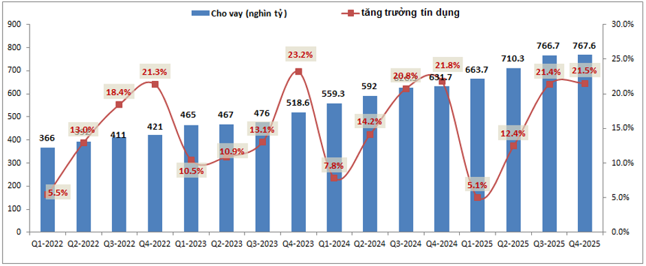 - Tiếp theo đến từ tăng trưởng KQKD của Q4-2025 có đóng góp chính từ tăng trưởng tín dụng cao trong năm với 21.5% và các mảng kinh doanh ngoài lãi cũng có phần tích cực. Chi tiết hơn từng mảng chúng ta sẽ bóc tách trong phần dưới bài viết.