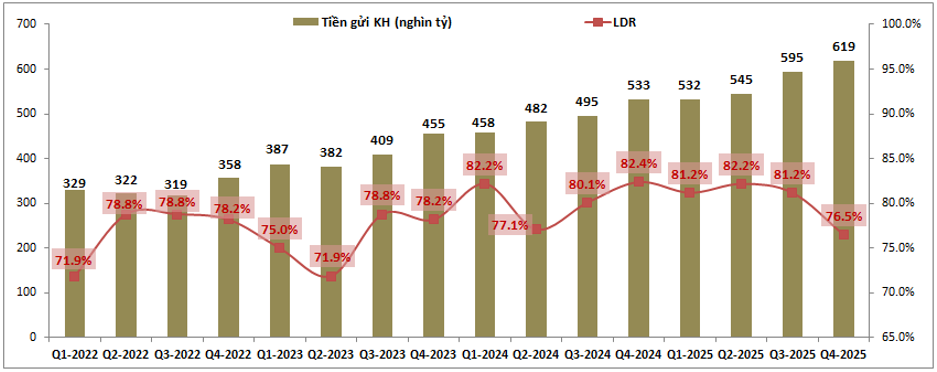 Tuy nhiên trong Q4 khi mà lãi suất tăng và cho vay chậm lại thì lượng tiền gửi đã tăng lên khoảng 24k tỷ đồng, qua đó đẩy LDR giảm xuống 76.5%. Lượng tiền gửi dự kiến có thể tiếp tục tăng tốt trong các quý tiếp theo của năm 2026 nhờ động lực lãi suất tiết kiệm duy trì mức cao. Điều này sẽ giúp TCB không còn gặp áp lực huy động tiền gửi đầu vào và cũng không phải tăng thêm lãi suất huy động nữa nếu lượng tiền gửi vẫn tiếp tục tăng mạnh như Q4 vừa qua. Chúng tôi kỳ vọng LDR của TCB có thể duy trì ở vùng 70-75% trong năm 2026.