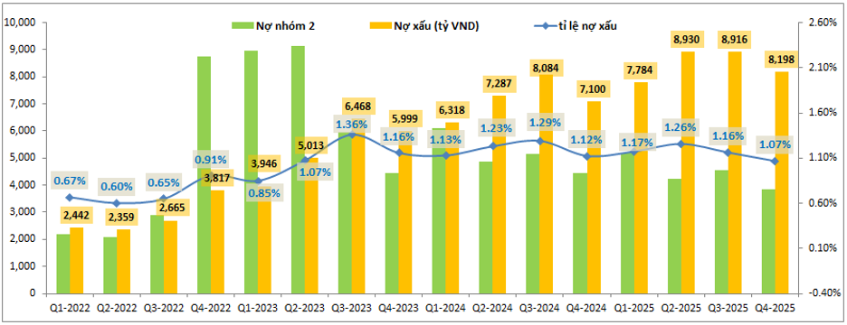 Bức tranh tài chính của TCB cũng có xu hướng tích cực dần trong các quý gần đây khi tỉ lệ nợ xấu có xu hướng giảm dần về mức quanh 1%. Cụ thể cuối Q4-2025 tỉ lệ nợ xấu của ngân hàng chỉ còn 1.07%, giảm 0.09% so với quý trước và đang trong xu hướng giảm dần từ cuối 2023 cho tới nay. Ngoài ra nợ nhóm 2 cũng có xu hướng giảm dần sau mỗi quý, tới cuối Q4-2025 chỉ còn khoảng 3,852 tỷ đồng. (Hình 5)