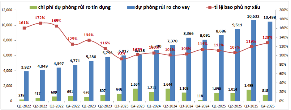 Điều này sẽ là động lực để TCB có thể tiếp tục duy trì xu hướng kiểm soát và giảm dần tỉ lệ nợ xấu của mình quay trở lại mức dưới 1% như các năm trước đó. Cùng với việc kiểm soát nợ xấu thì TCB cũng đã tăng thêm khoảng 10% chi phí dự phòng rủi ro tín dụng của ngân hàng trong năm 2025 so với 2024 trước đó nên đã giúp cho bộ đệm dự phòng tăng lên đáng kể. Tỉ lệ bao phủ nợ xấu của TCB đã tăng lên 128% vào cuối Q4-2025, tăng 21% so với cuối Q2-2025. (Hình 6)
